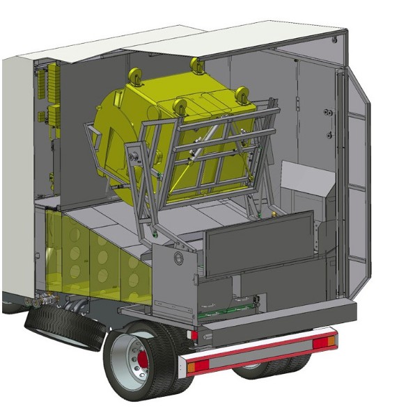 Данное оборудование используется для автоматической очистки контейнеров для отходов и / или производства контейнеров емкостью до 1100 литров. За цикл работы могут быть очищены два маленьких контейнера или один большой контейнер. После выбора программы очистки контейнеры автоматически перемещаются в кабину для очистки.