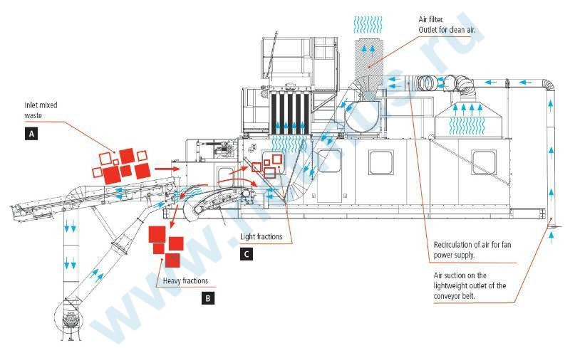 Это надежная высокопроизводительная установка для отделения легкой фракции от тяжелой. Основное назначение установки – удаление неподходящего материала для увеличения срока службы комплекса и сокращения износа оборудования для вторичной переработки отходов на стандартных технологических линиях для переработки отходов в твердое восстановленное топливо (SRF). Высокая эффективность достигается благодаря оптимизированному расчету воздушного потока. Возможность регулировки различных настроек для достижения максимального уровня производительности для разных материалов. Увеличение срока службы установки для вторичной переработки отходов в результате удаления неподходящего материала. Минимальные эксплуатационные затраты и затраты на техобслуживание.