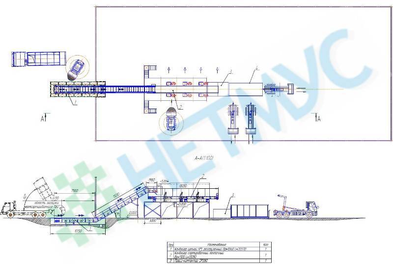 Конвейер предназначен для работы операторов по сортировке ТБО. Оператор при выделении полезной фракции сбрасывает её в бункер вниз. Вдоль сортировочного конвейера расположены посты (рабочие места) с люками. С каждой стороны конвейера располагается согласованное с Заказчиком количество постов. Количество человек, обслуживающих линию сортировки, также зависит от количества постов согласно технического задания Заказчика. Часть выделенных компонентов (макулатура, ПЭТФ, пластмасса высокого и низкого давления и т.д.) через люки поступает в накопительные отделения, и попадают в передвижные контейнеры или на бетонное основание. По желанию Заказчика мусоросортировочный комплекс комплектуется сортировочной кабиной для более комфортной работы персонала комплекса. Сортировочный ленточный конвейер установлен на платформе для сортировки и предназначен для транспортировки ТБО и для ручной разборки. В сортировочной кабине с двух сторон сортировочного ленточного конвейера организованы посты ручного отбора вторичного сырья. Из ТБО последовательно отбираются бумага, картон, текстиль, пленка, пластиковые бутылки, цветной металлолом, стекло и др. Стекло и цветной металлолом сбрасываются через люки в стоящие на полу контейнеры. Бумага, картон, текстиль, пленка и пластиковые бутылки сбрасываются через люки в бункеры или на бетонное основание и по мере наполнения перемещаются к цепному подающему в пресс конвейеру. (Также возможен вариант автоматизированной подачи полезной фракции).