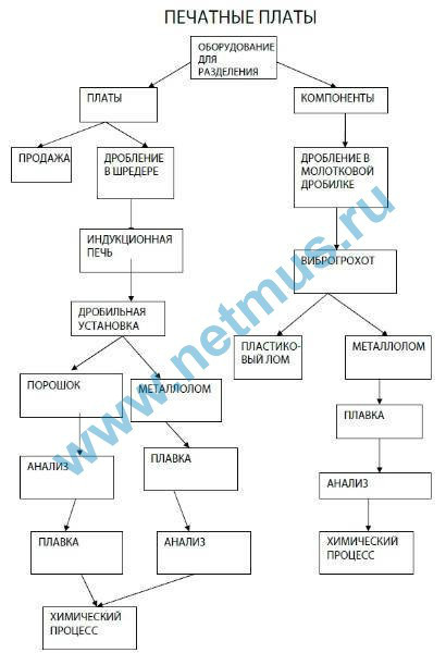 В других заводах в этом разделе описана технология переработки компонентов. Итак, у нас остались платы, состоящие на 80% из меди, на 15% из текстолита и на 5% из прочих металлов.
