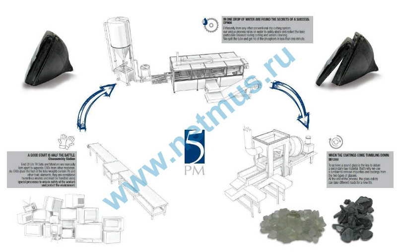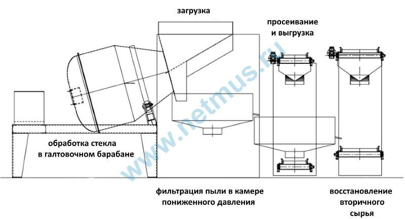 • стекла двух сортов, получаемые в станке DP800 (Бариевое стекло и свинцовое стекло), загружаются в барабан через приемник, отдельно друг от друга. При вращении барабана частицы стекла разбиваются и измельчаются. Возникающее трение между частицами стекла действует как шлифовка, которая удаляет смолы и краски с поверхностей стекла.