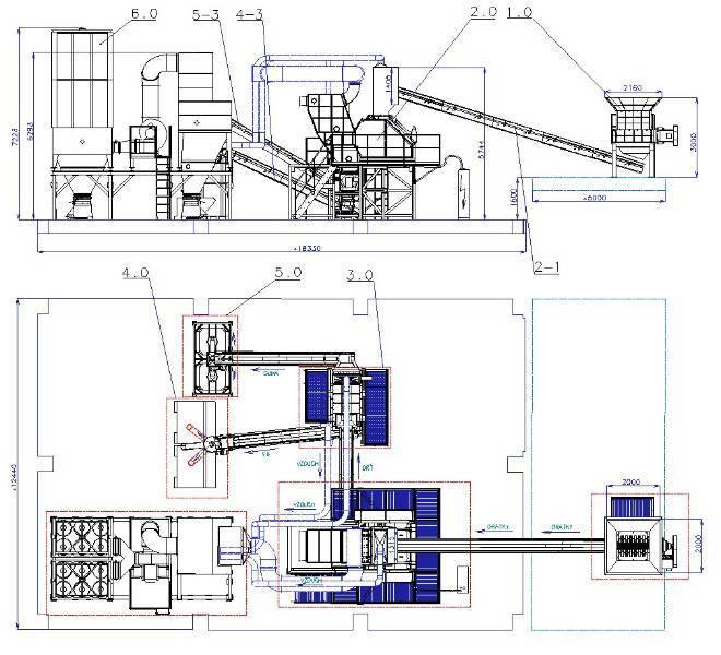 С помощью погрузчика материал засыпается в подающее устройство с медленно движущимся валом (на схеме 1.0) мощностью 15 кВт. Вес подающего устройства 5 т, оно установлено на основании с четырьмя ножками. Данный медленно движущийся механизм не оказывает динамического воздействия на основание. Под каждой ножкой имеется металлическая площадка 250 x 250 мм. В этом же месте установлен выключатель установки. Для рабочих специально установлен сигнальный маяк и звуковая сигнализация. Когда сигнальный маяк светит зеленым светом, то линию можно заполнять материалом. Разделенный материал падает на расположенный под наклоном ленточный транспортер, и конвейер переправляет его в специальное перемалывающее устройство, которое используется для более мелкой переработки металлических пучков проволоки. Перемалывающее устройство полностью защищено сменным слоем из износостойкой стали HARDOX 500. Лезвия ножей выполнены из карбидов твердостью 85 HRC. Срок годности лезвий до следующей заточки составляет около 24 часов беспрерывной работы линии. Заточка ножей должна проводиться только алмазными дисками. По истечении данного времени ножи необходимо снять и заменить. Израсходованные ножи следует заточить заново. Допустимое количество заточек приблизительно составляет от 8 до 12 раз. Перемалывающее устройство находится на металлической конструкции, которую необходимо прикрепить анкерами к полу вследствие динамического воздействия оборудования. Общая масса оборудования составляет 12 тонн, ротор перемалывающего устройства вращается со скоростью 500 оборотов в минуту, из-за чего возникает сильное динамическое воздействие на основание. Перемалывающее устройство заключено в резиновые боковые стенки «silent» для снижения вибрации и помещено в специальную раму. Основание завершается шестью ножками с нижней металлической частью 250x250 мм. Конструкция должна быть прикреплена к полу. К перемалывающему устройству также подсоединена система камер, в которой осуществляется откачивание материала и происходит охлаждение оборудования. Здесь также происходит частичное удаление пыли, текстиля, ржавчины (на схеме 6.0), пропущенные через фильтр в контейнер для отходов. Фильтры снабжены управляемыми стряхивающими вибродвигателями, и их управление осуществляется с помощью клапанов, которые управляются пневматическими цилиндрами. Это требует сжатого воздуха под давлением 0,6 МПа подающегося через блок очистных сооружений, так, чтобы он был свободен от воды, грязи и взвесей (компрессор не входит в поставку оборудования). Масса фильтров составляет 4 тонны, под ними необходимо установить бетонное основание. Фильтры не оказывают никакого динамического воздействия на пол и прикрепляются только с помощью 8 металлических креплений размером 250 x 250 мм. Уже без пыли и взвесей, измельченный переработанный материал выходит из камеры, который приводится в движение шнековой коробкой передач потребляемой мощностью 0,750 кВт. Материал выходит и попадает на ленточный транспортер, который доставляет смесь к станции двойной магнитной сепарации (на схеме 3.0). Здесь материал падает на вибрационный транспортер, на котором начинается процесс встряхивания и укладки более тонким слоем так, чтобы обеспечить более качественную магнитную сепарацию. В конце находится барабанный магнитный с