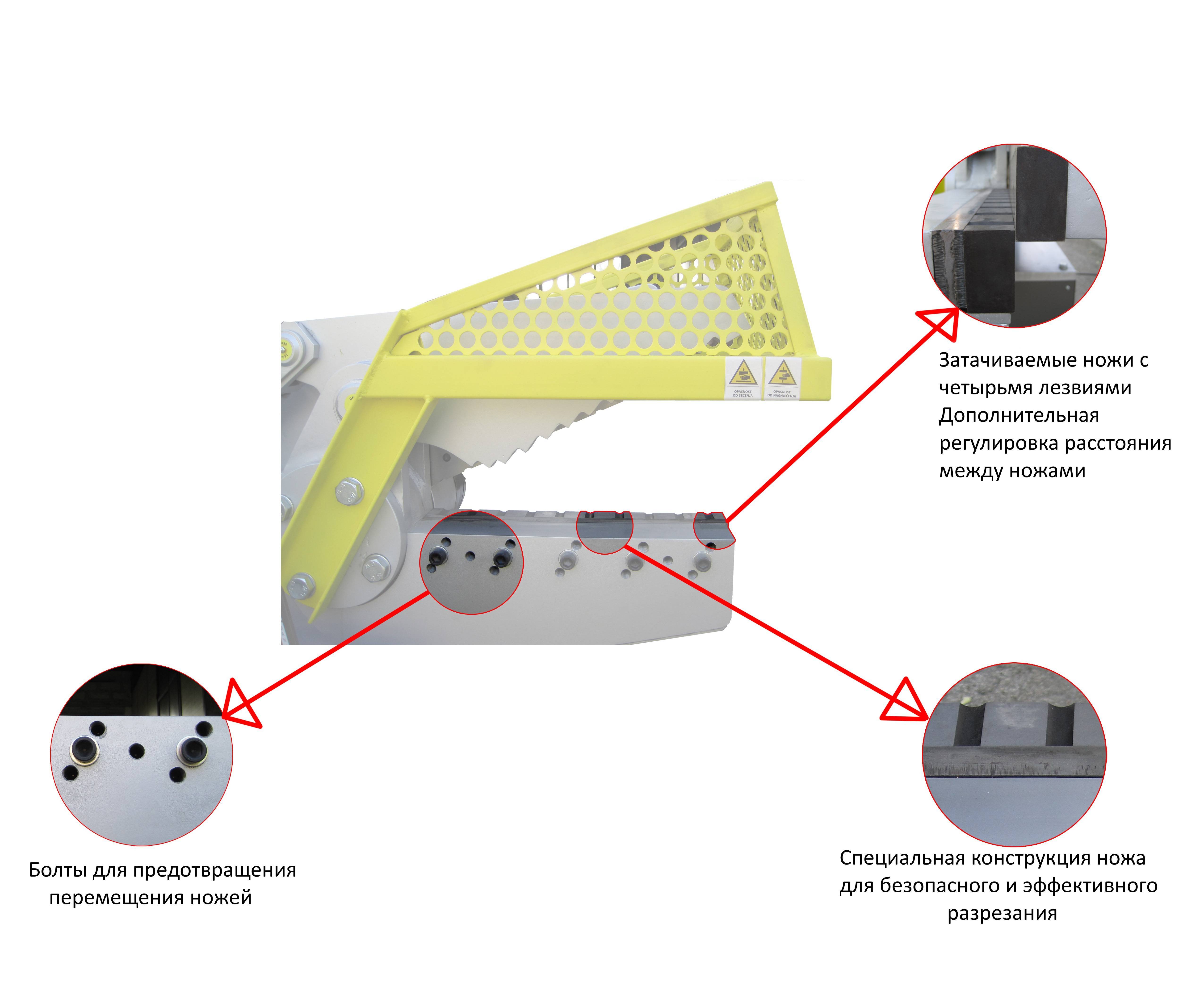 Гидравлические ножницы являются идеальным решением для любого типа отходов. Данные гидравлические ножницы подходят для легкой и быстрой резки черного и цветного типа металлов. Ножницы просты и надежны в работе. Они подходят для следующих типов материалов: трубы, профили, кабель, арматура, тонкие пластины металла. Когда речь идет о переработке металлолома, данные гидравлические ножницы являются оптимальным решением. Их установка и настройка не требует специальных знаний, осуществляется легко и быстро. В ножницах есть два режима работы: механический (с помощью ножной педали) и автоматический. В зависимости от типа материала выбирается оптимальный режим работы. Ножницы соответствуют сертификату СЕ, РФ. После 100 тонн работы ножи можно переворачивать (они имеют 4 режущих лезвия), примерно через 400 тонн переработки металлолома, ножи снимаются для повторной заточки.